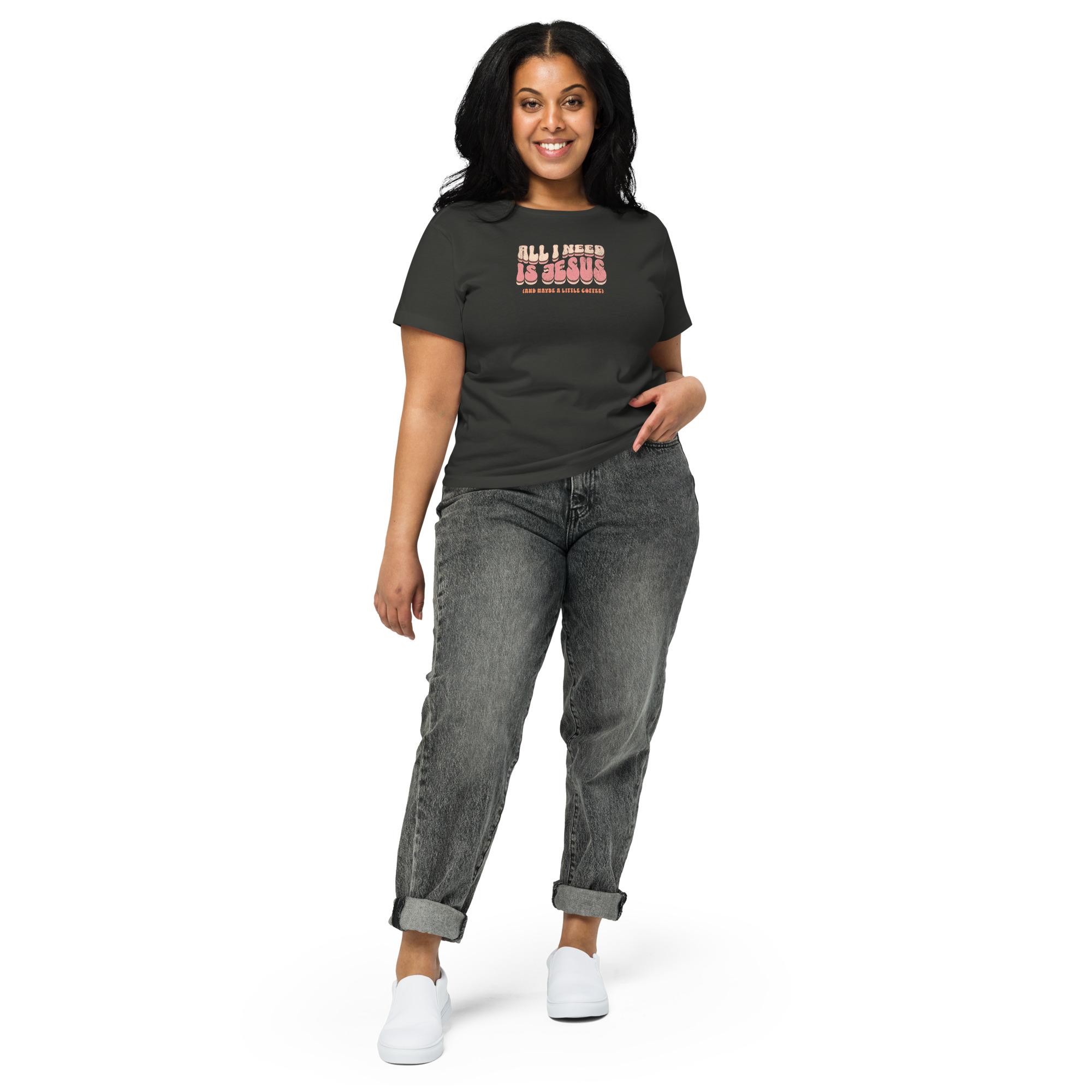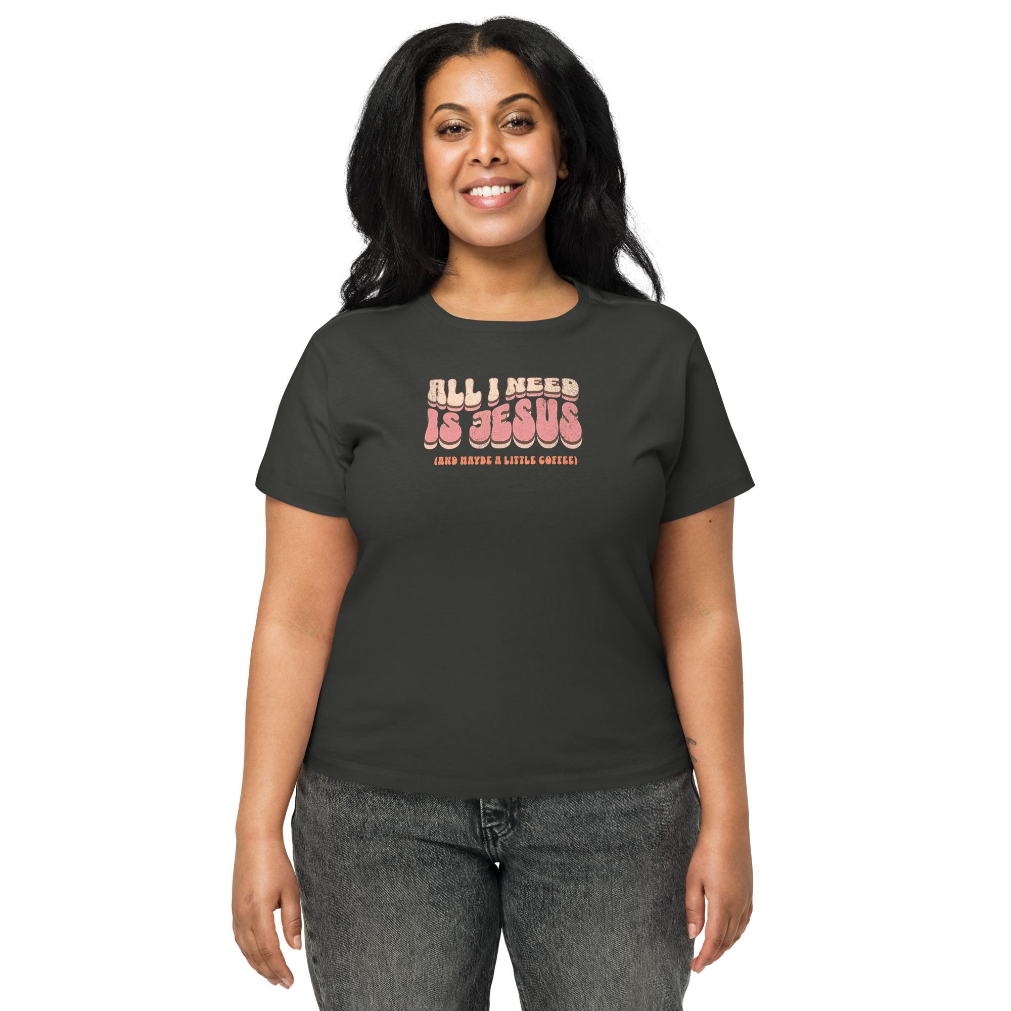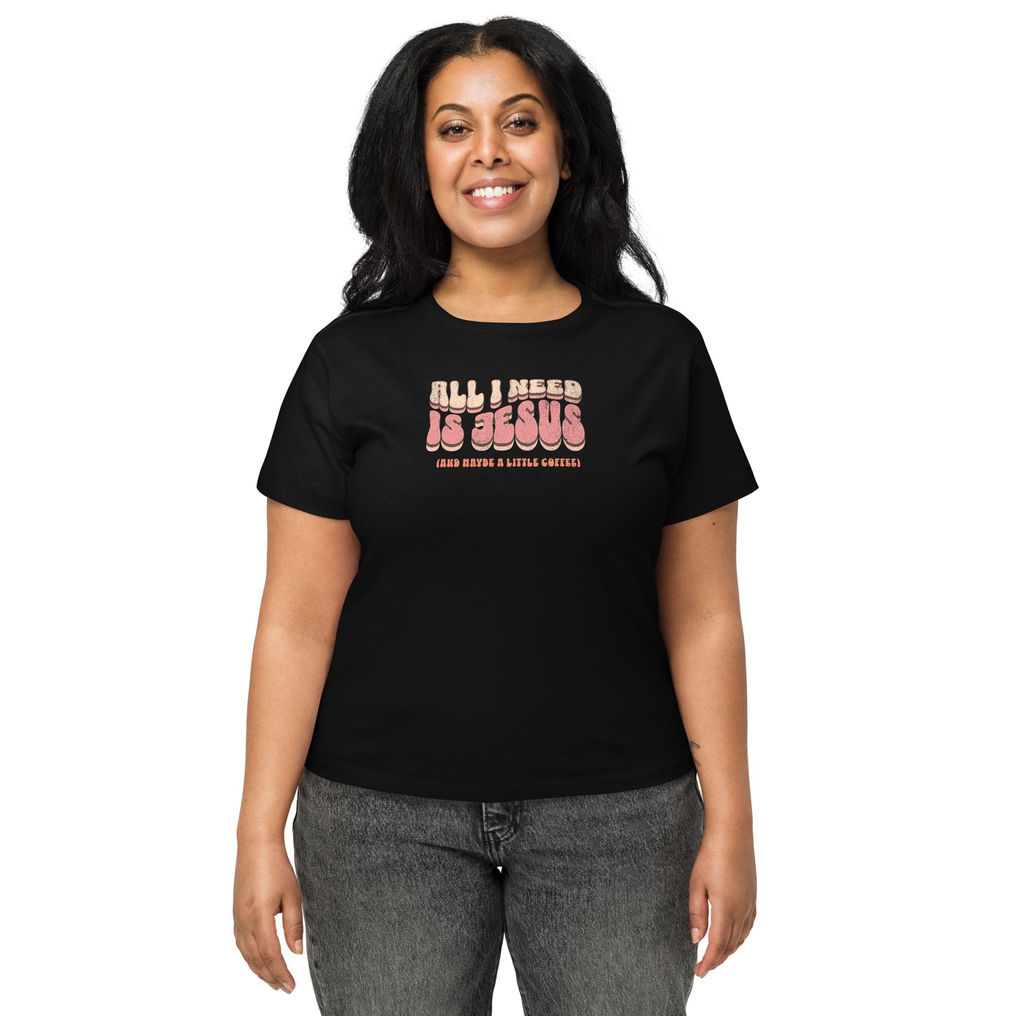 Elevate your casual style with our “Faithful Caffeine Connection” Women’s T-Shirt – a delightful blend of faith, humor, and comfort. This t-shirt showcases a captivating typographic design that boldly declares, “All I need is Jesus (and maybe a little coffee).”