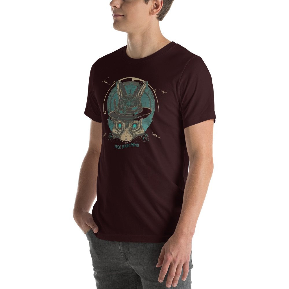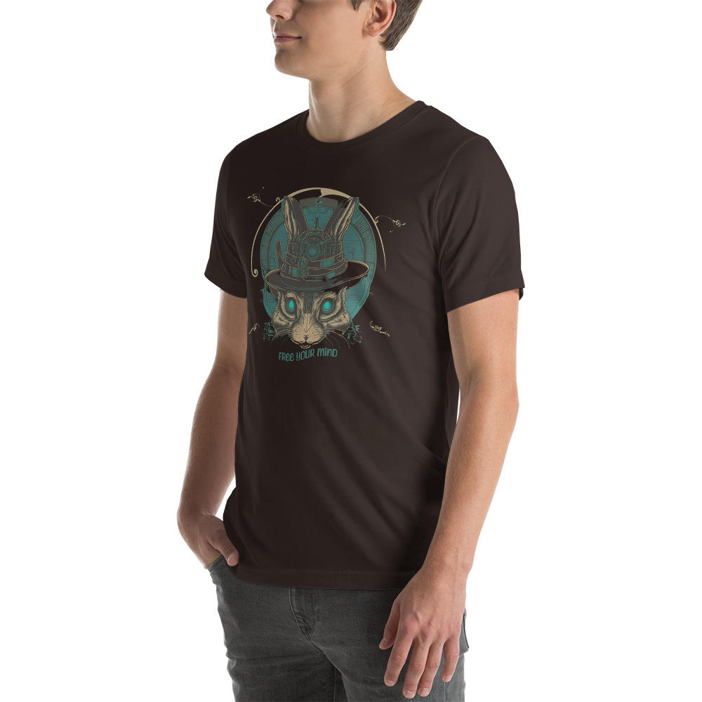 Step into a world where gears and cogs interweave with imagination and curiosity with our Mechanical Hare: Free Your Mind Steampunk T-Shirt. This unique design combines the enigmatic allure of steampunk aesthetics with a thought-provoking illustration of a rabbit head fused with intricate machinery, serving as a powerful reminder to embrace the boundless possibilities of the mind.
