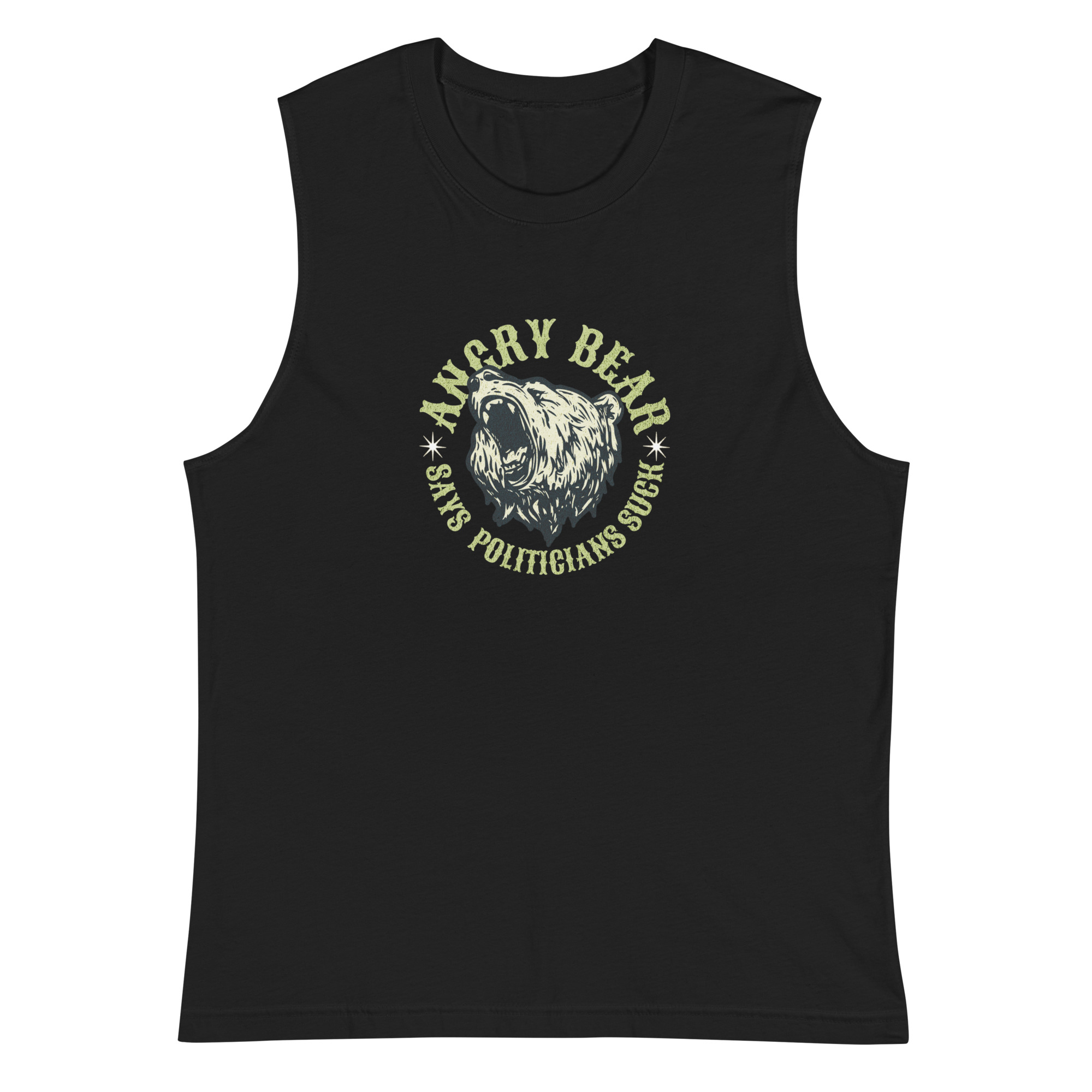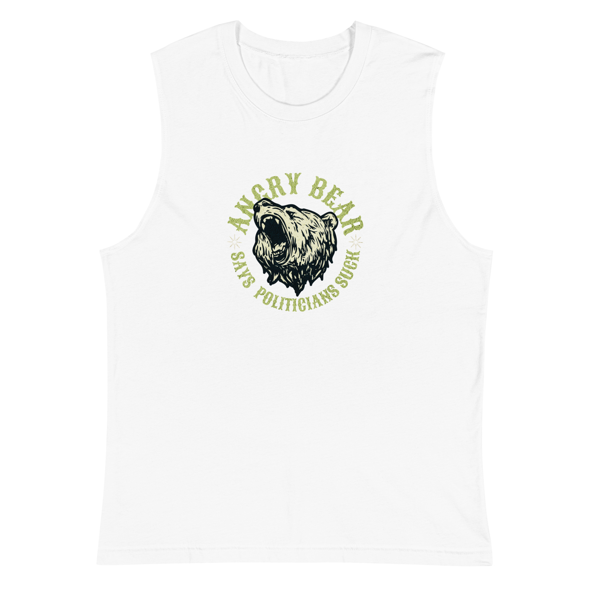 Embrace your inner rebel and showcase your sculpted physique with our Muscle-Bound Rebel: Angry Bear Politicians Suck Men’s Muscle Shirt! This edgy and attention-grabbing muscle shirt features a powerful graphic of an angry bear and the bold phrase, “Politicians Suck.”